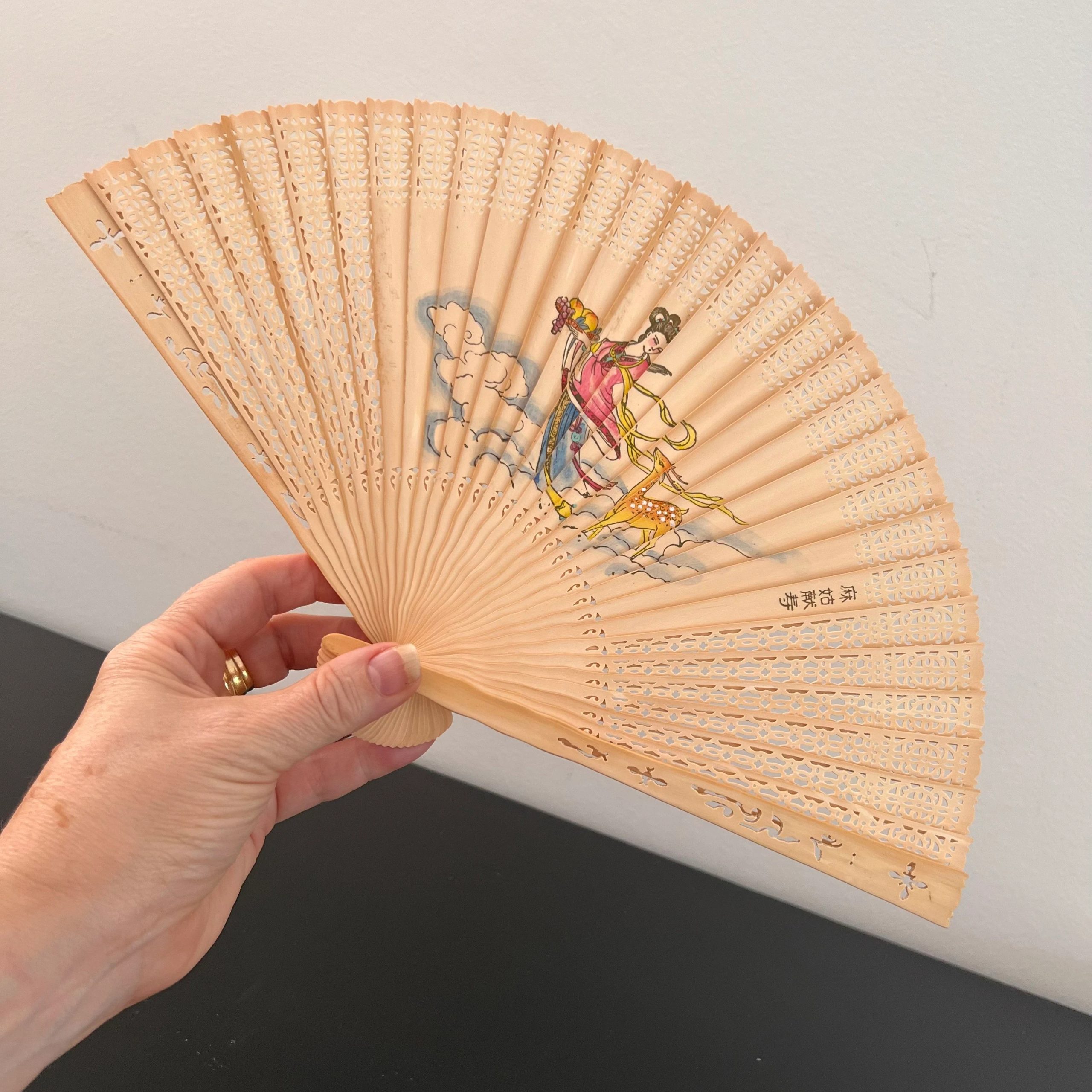 This elegant wooden folding hand fan features intricate carved openwork detailing and a traditional celestial maiden illustration at the center, surrounded by soft cloud accents and flowing ribbon details. The natural light wood tone gives it a warm vintage feel, making it a beautiful accessory for both practical use and decorative display.