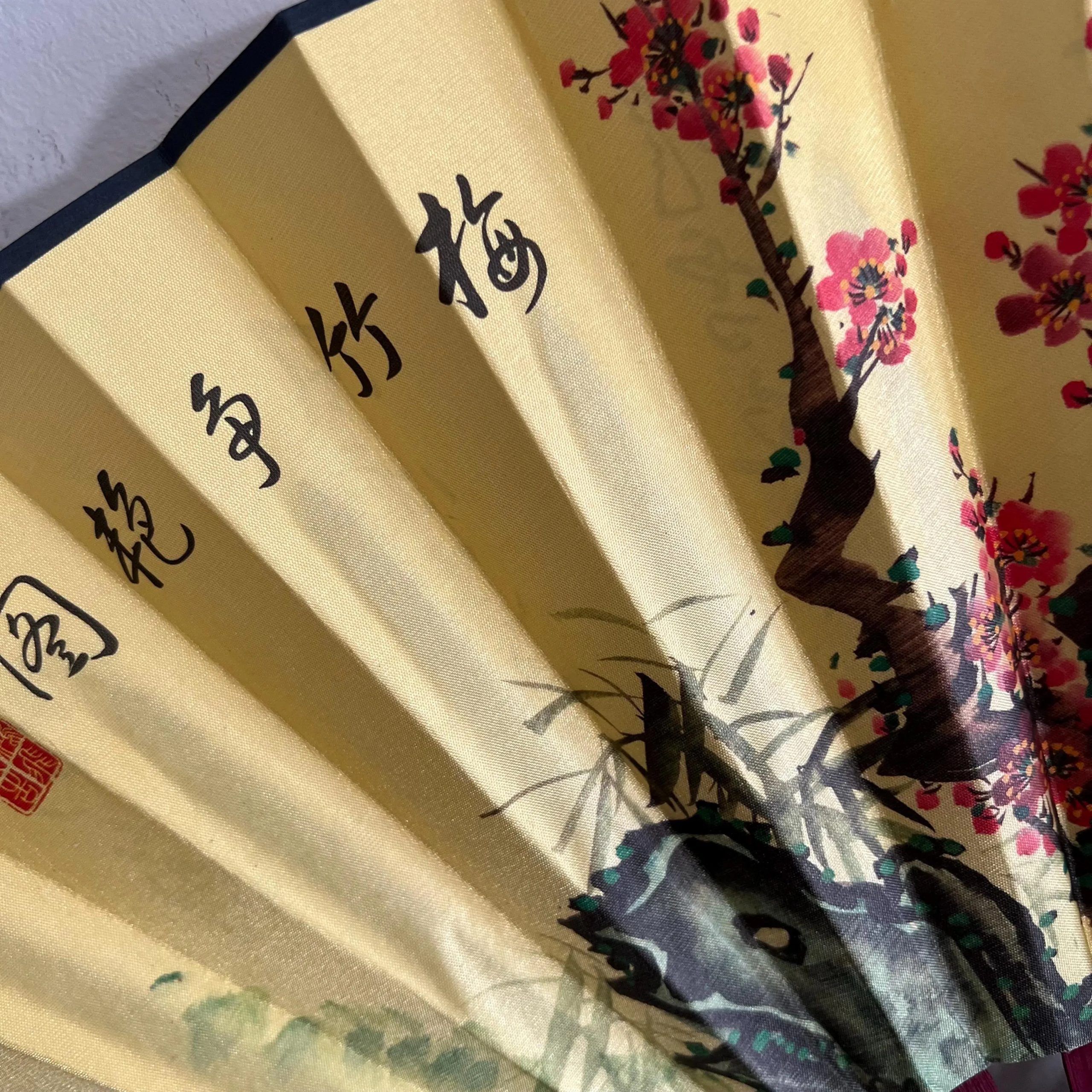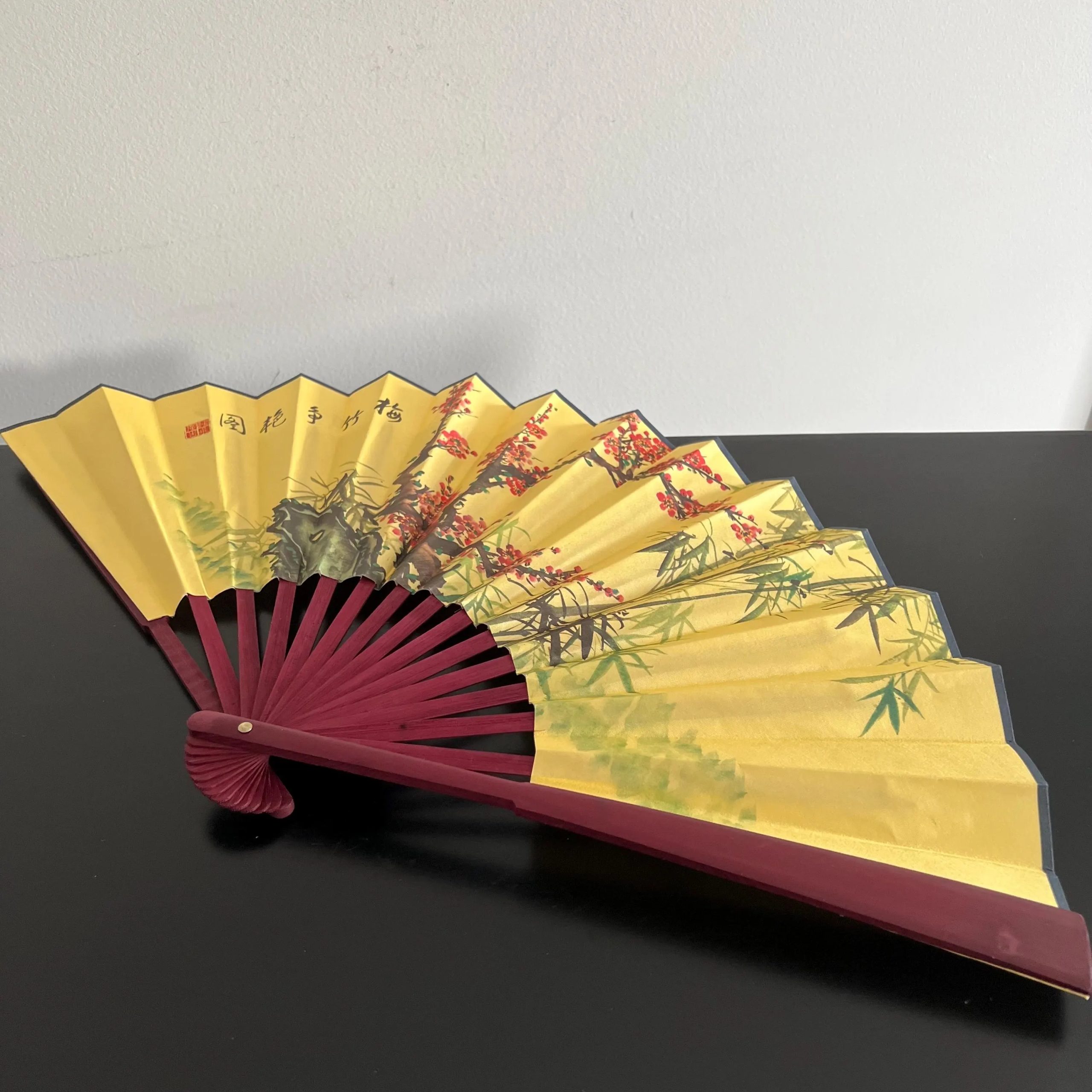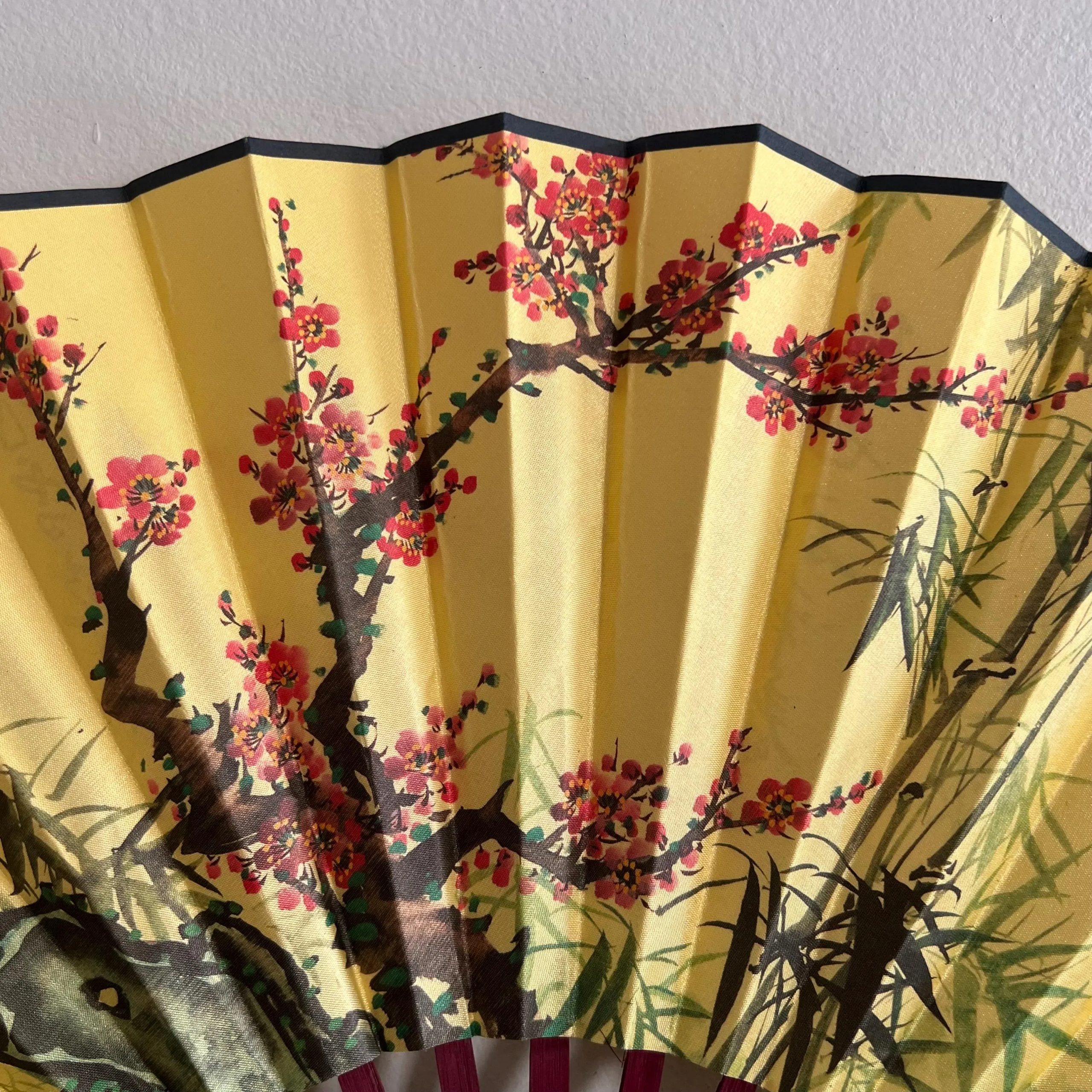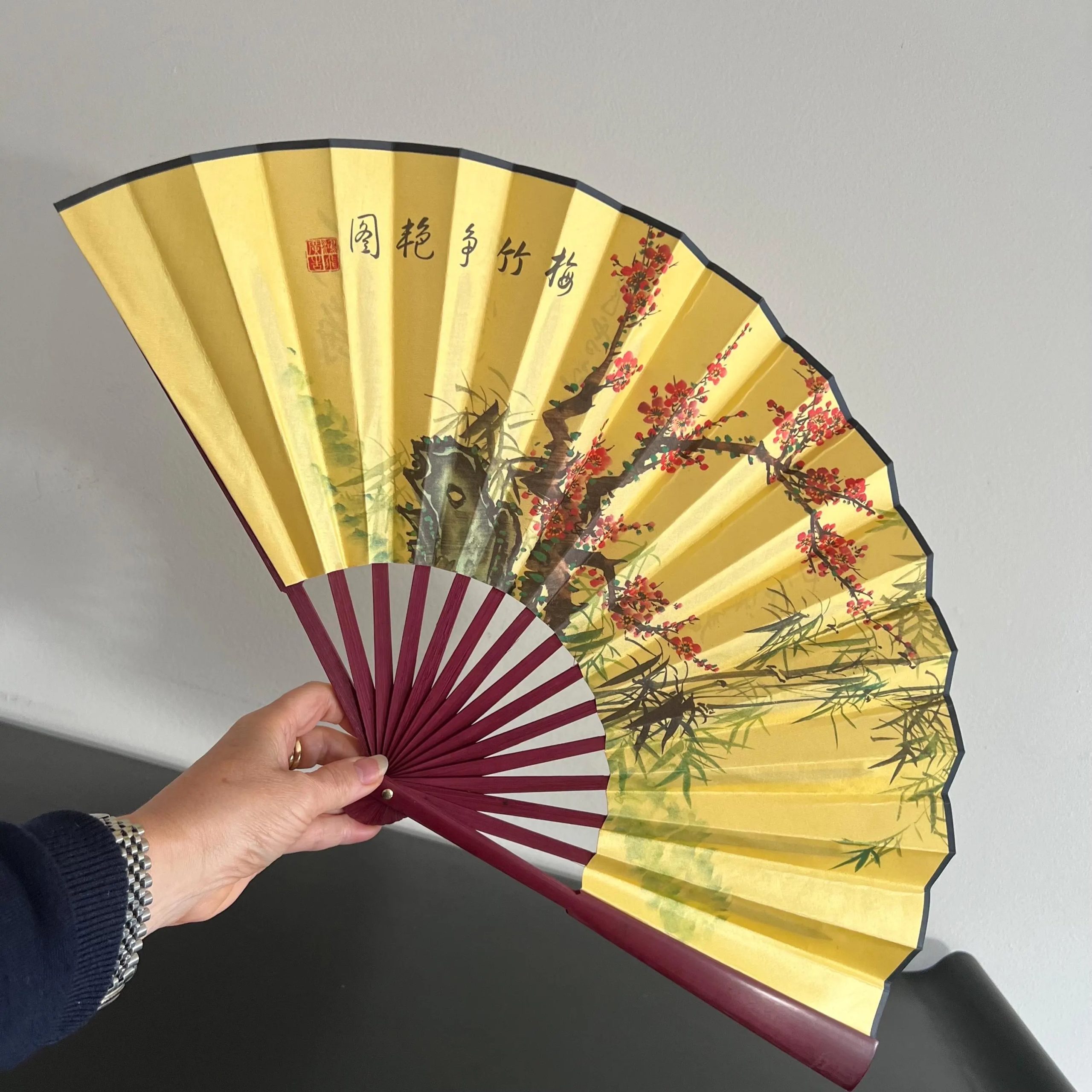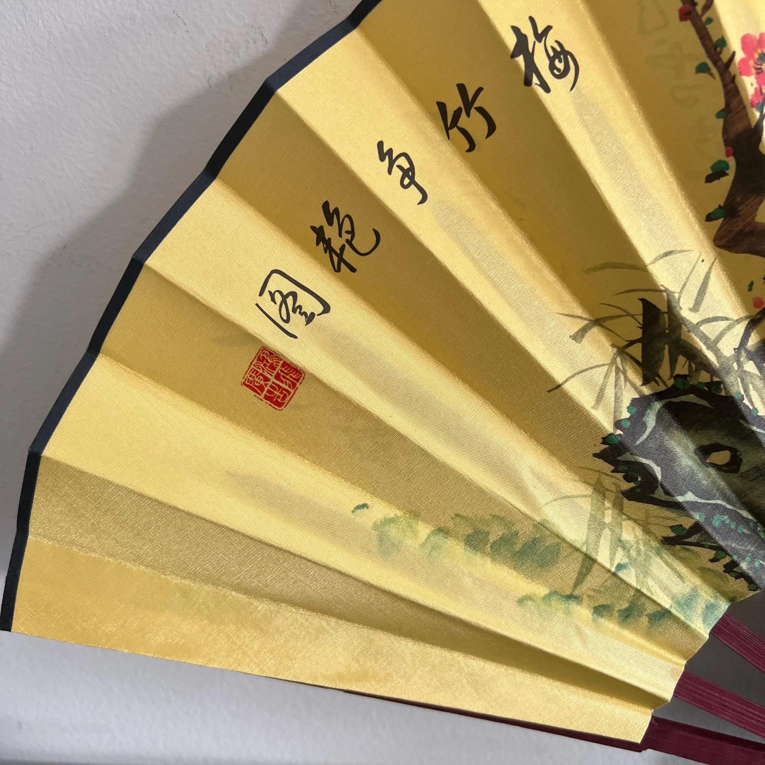 This elegant folding hand fan features a traditional Chinese floral painting with blooming plum blossoms and bamboo on a rich golden-yellow background. The black edge trim and deep burgundy wooden ribs create a striking contrast, giving the fan a refined oriental look that works beautifully as both a practical accessory and a decorative display piece.